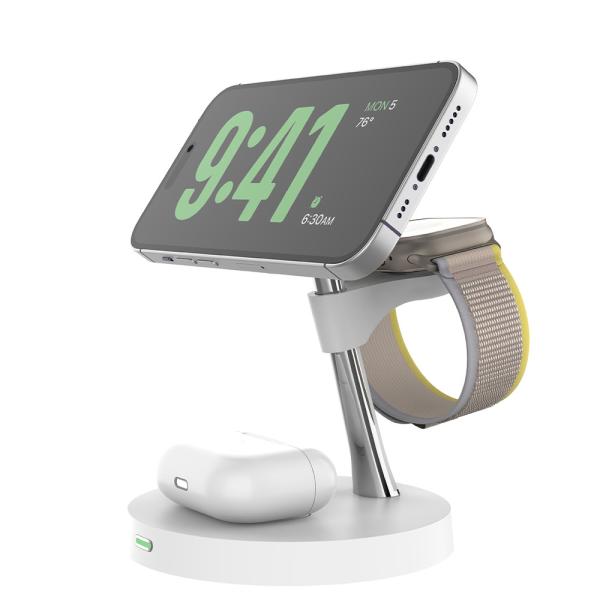 This product is a Qi standard all-in-one multi-functional magnetic fast wireless charger, which can supportiPhone12/13/14/15 series magnetic featured phones, Apple Watch, Samsung Watch, other QI standard mobile phones,Airpods and Samsung TWS.It is a convenient and practicable smart electronic device. The magnetic part of this product adopts magnetic coil design. You can place the phone vertically or horizontally while charing the phone. When you watch your favorite videos while charging, you can adjust the charging part up and down to find the proper angle.The product is designed with the magnetic double coil, those Multiple Angles are adjustable, and you can place the phone vertically or horizontally without affecting charging.